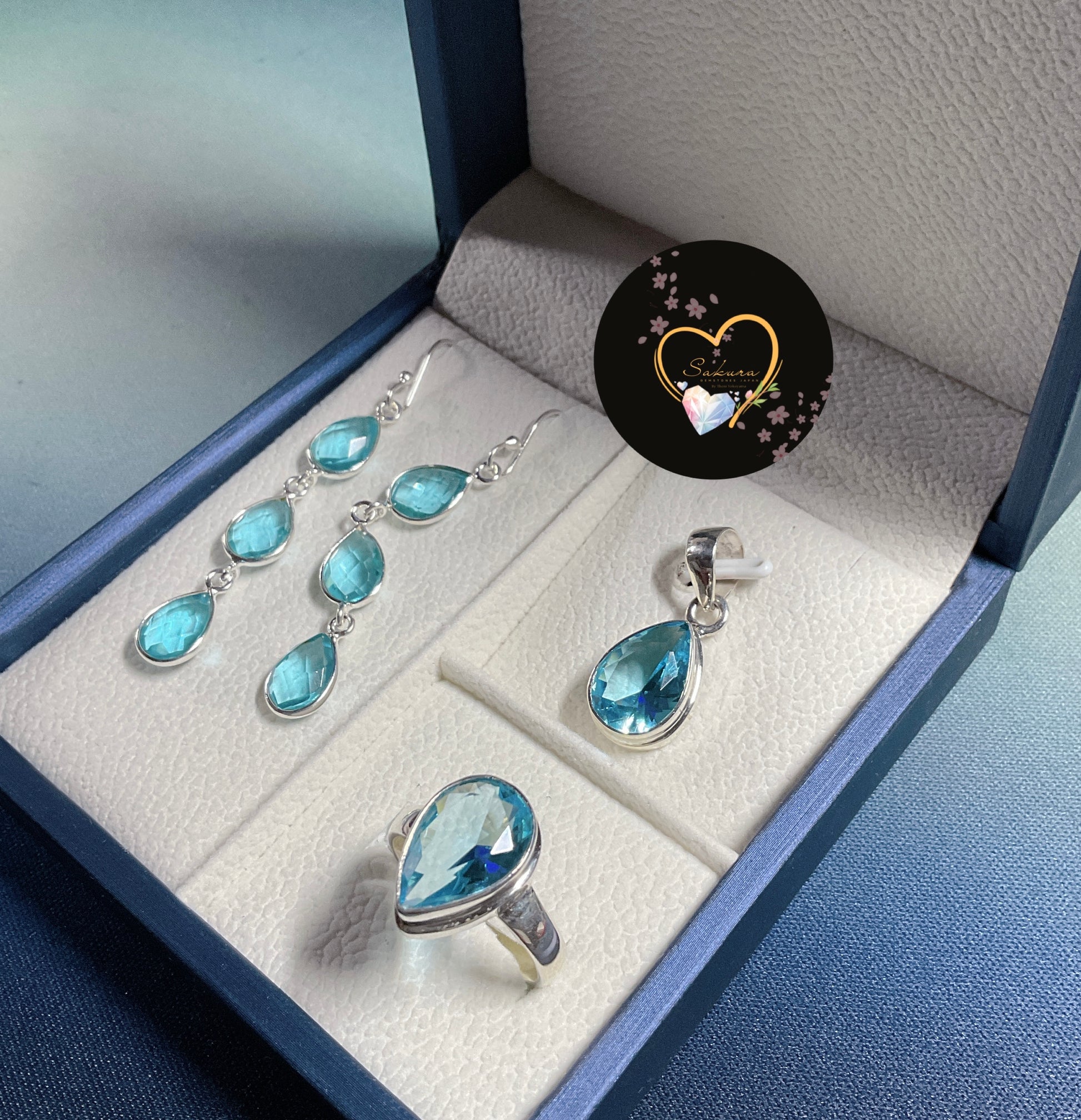 Perfect Silver s925 Blue Topaz Drop Jewel Set ( gift set for her / birthday gift / Christmas gift in faceted cut ) Made from 産地: Italy🇮🇹